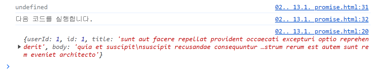 콘솔에서 실행결과를 보면 다음과 같이 서버로 부터 응답을 받아온 후 다음 코드가 실행.