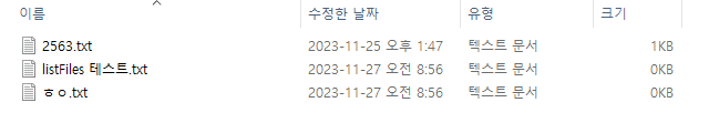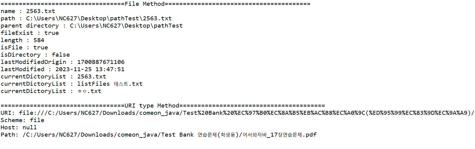 관련 메소드의 경우는 전부 있는건 아니지만 사용할 것 같은건 작성을 해봤다. 의문인건 getPath() 값을 가져오는 경우 현재 디렉토리의 상위 디렉토리가 아닌 앞에 파일이름만 뺀 path값이 나온다. OS마다 다른건지.. 찾아봐도 별 얘기가 없는것 같아서(해당 내용의 경우 좀 더 알아보고 내용 추가) 유념해두고 사용해야겠다. 날짜의 경우 타입이 long으로 나오기 때문에 포메팅 해줬다. (교제에는 그냥 printf로 출력형식만 맞춰줌) 파일리스트의 경우 File 타입의 배열로 값을 받는다.