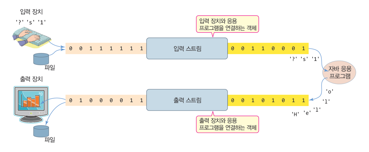 이 흐름들의 양끝에는 프로그램(Java 응용프로그램)이 있고 그 반대에는 입출력 장치(키보드, 디스크, 프린터 등)나 네트워크 등이 있다.