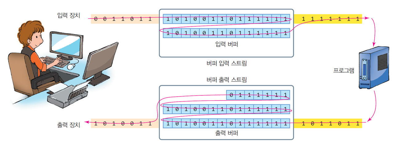 입력 스트림에 먼저 들어온 데이터가 응용프로그램에 먼저 전달되고, 출력 스트림은 응용프로그램이 출력한 순서대로 출력 장치에 보낸다.