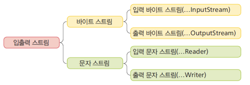 java.io 패키지는 안에 스트림을 지원하는 클래스들이 있는데, 이들 클래스를 몇 가지의 기준에 따라서 분류할 수 있다. 먼저 취급하는 데이터의 종류에 따라 크게 바이트 스트림과 문자 스트림으로 분류할 수 있다.