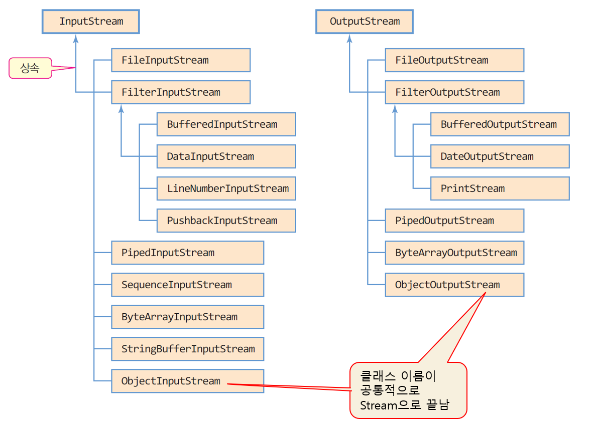 모든 바이트 스트림 클래스들은 추상 클래스인 InputStream와 OutputStream에서 파생된다.