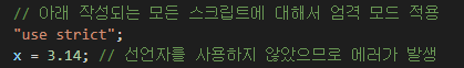 아래 작성되는 모든 스크립트에 대해서 엄격 모드 적용*/