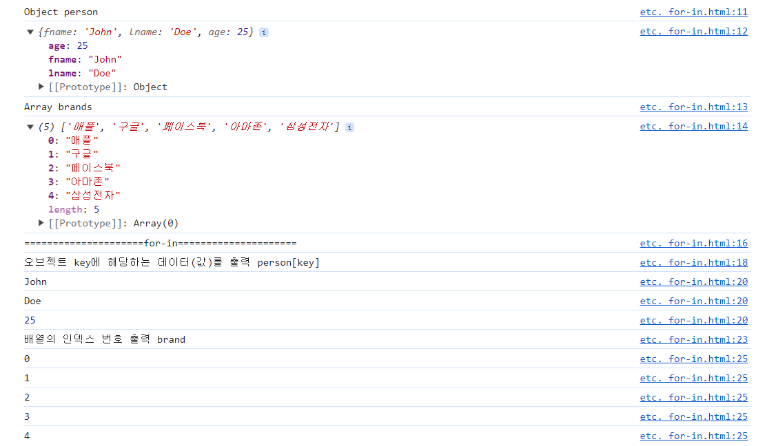 for-in문은 데이터 타입중 배열뿐만 아니라 Ojbect에도 사용할 수 있는 반복문이다. Object 내에 정의된 키 값의 수만큼 코드 블록을 실행