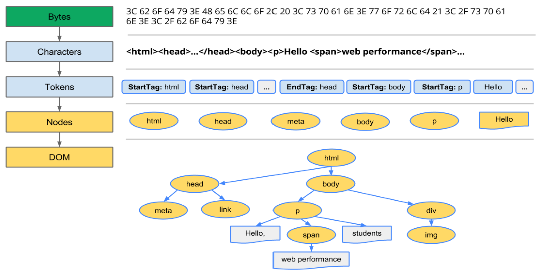이렇게 받아온 HTML의 원시 바이트를 위에 과정을 거쳐서 DOM 트리가 된다.