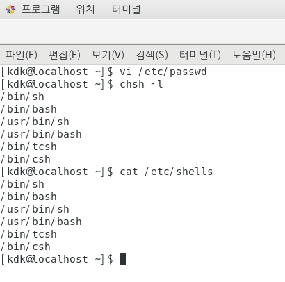 현 시스템에서 바꿀 수 있는 셸의 종류는 /etc/shells 파일에 지정되어 있다.