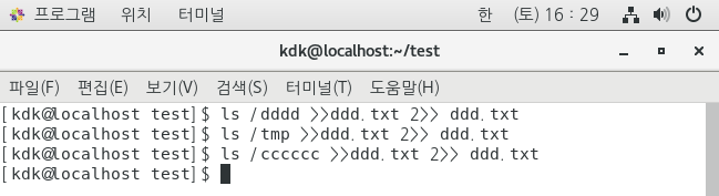 2>, 2>> : 표준 오류 메시지를 파일에 저장한다.