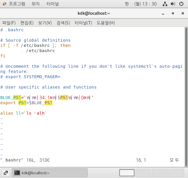 위에서 설정한 alias나 prompt는 로그아웃을 하면 모두 사라진다. 이것을 환경 설정 파일에 필요한 설정을 저장하고 로그인 할 때 마다 불러오게 하자.