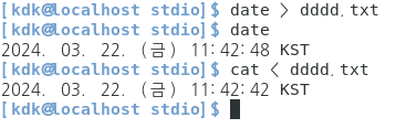 cat 명령은 파일의 내용이나 키보드로 입력을 받아 화면에 출력하는 명령이다. cat 명령이 파일을 읽어서 출력하는 기능은 <를 생략한 것으로, 표준 입력이 자동으로 파일로 리다이렉션한 것이다.