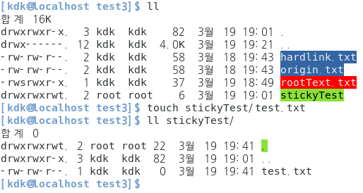 root 계정으로 stikcyTest 디렉토리에 chmod 1777 stikcyTest 권한 부여 후
