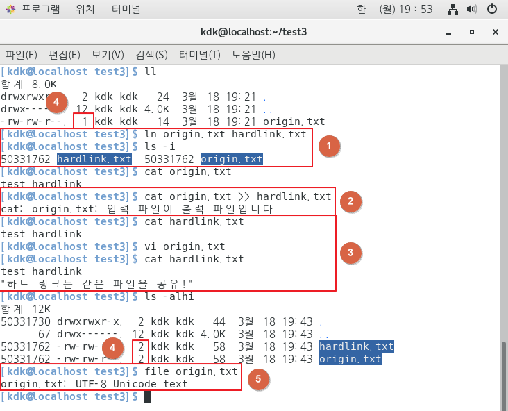 ④ : 맨 위에 origin.txt와 비교하였을 때 하드 링크의 개수가 늘어난 것을 확인할 수 있다.