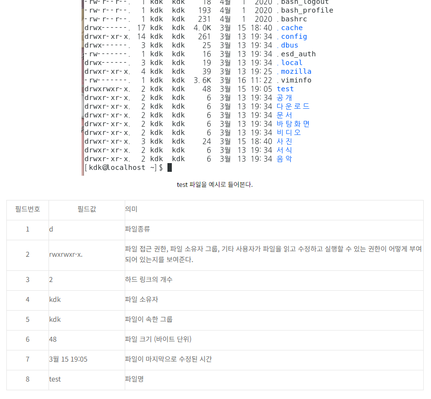 | 읽기 | 파일을 읽거나 복사할 수 있다. | ls 명령으로 디렉토리 목록을 볼 수 있다. (ls 명령의 옵션은 실행 권한이 있어야 사용할 수 있다) |