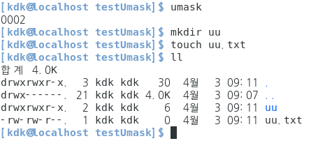 umask 명령만 사용하면 다음과 같이 현재 설정된 기본 마스크 값을 보여준다. (0002)