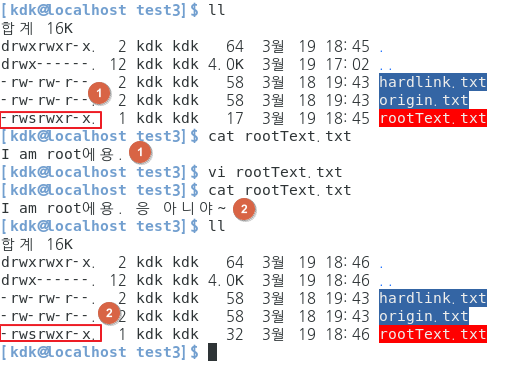 ② : kdk 계정으로 텍스트 파일 수정이 가능하다. (파일 실행할 때는 파일 소유자인 root 권한 적용)